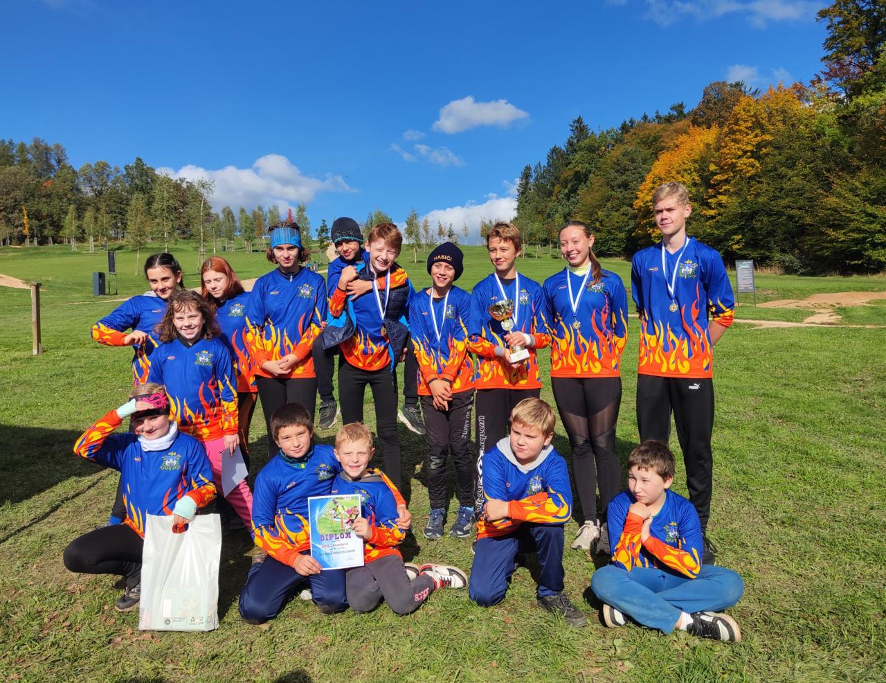 Na start závodu jsme za náš sbor nasadily dohromady 3 družstva, z toho 1 družstvo mladších žáků a 2 družstva starších žáků. Mladší žáci ve složení Adéla Žižková, Václav Lukeš, Jan Sičák, Martin Brand a Martin Mlčoch si se závodem zdárně poradili a umístili se na krásném 10. místě. Ve starší kategorii se nám dařilo o něco více. Starší B ve složení Nikola Žižková, Tereza Prokopová, Barbora Kracíková, Natálie Čiháčková a Vilém Weber vybojovali krásné 5. místo, starší A ve složení Šárka Schveigerová, Vítek Schveiger, Martin Brodský, Jakub Stahoň a Jan Weber se dokonce postavili na nejvyšší stupínek a brali celkové 1. místo, které jim zajistilo postup na krajské kolo 9. 11. opět ve Vratislavicích nad Nisou.