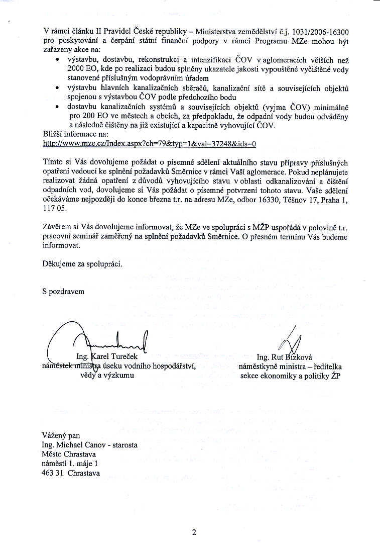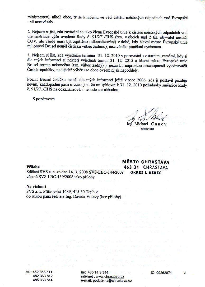 V Chrastavě existuje plně funkční čistička a cca 60 % obyvatel je napojeno na kanalizační síť. Pokud by toto číslo do 31. 12. 2010 nevzrostlo na hranici, která bude stačit ministerským úředníkům (prý 85 %) a pokuta by nám reálně hrozila, budeme se pochopitelně právní cestou bránit.