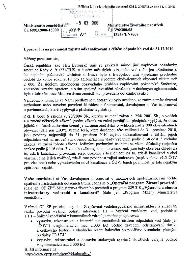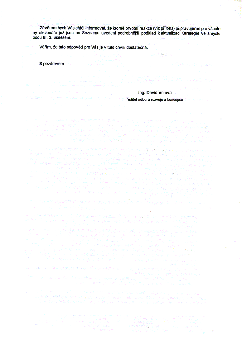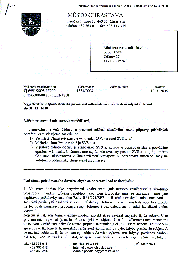 Uvádíme zde dopis Ministerstva životního prostředí a zemědělství (strana 1, strana 2), vyjádření SVS a. s. (strana 1, strana 2) a odpověď starosty města (strana 1, strana 2) (schválena ZM všemi 19 hlasy).