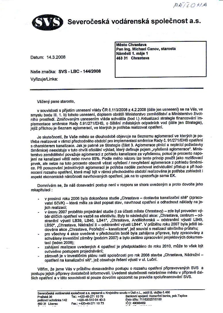 Co se týče další dostavby kanalizační sítě, je třeba podotknout, že SVS a. s. je vypracována studie na optimální dostavbu kanalizační sítě na území města Chrastava. Navíc – zcela mimo původně plánovaný harmonogram – zahrnula SVS a. s. přednostně do svého plánu realizaci kanalizace v Pobřežní ul. (před realizací II. etapy přeložky II/592).