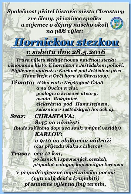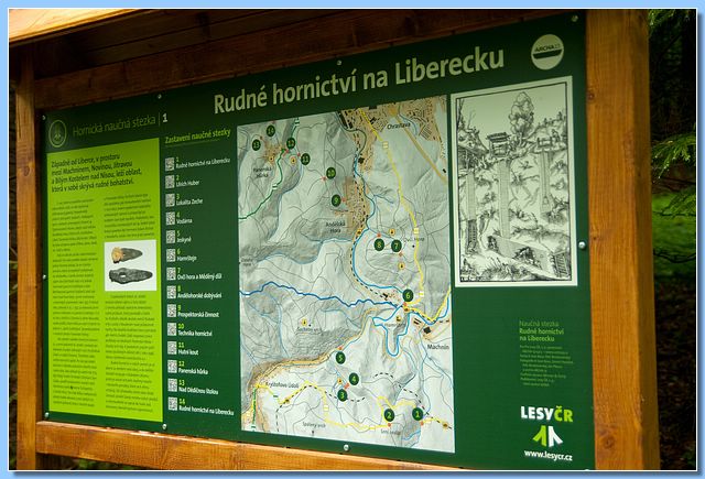 Hornická stezka začíná u vlakového nádraží v Karlově pod Ještědem a především zde začíná přírodní rezervace „Karlovské bučiny“. Pokračuje kolem „Červeného kříže“, dojdeme do „Důlního příkopu“ (Zechengraben), pokračujeme po cestě dolů údolím k silnici na okraji Kryštofova Údolí, kde stávala samostatná obec Rokytnice (Eckersbach). Jsme v oblasti krystalických vápenců a to připomínají i opuštěné doly (největší býval v místě dnešních tenisových kurtů). Vydáme se podél Rokytky a Nisy k Hamrštejnu, ke kterému se přemístíme na transbordéru. Závěrečný úsek vede po lesní vrstevnicové cestě západním úbočím Ovčí Hory, dovede nás k andělohorskému mostu přes řeku Nisu, pokračuje kolem bývalé Textilany a dále Ještědskou ulicí kolem sochy sv. Jana Nepomuckého. Výlet končíme na náměstí 1. máje… odměnou za prožité putování je občerstvení v restauraci Gloria.