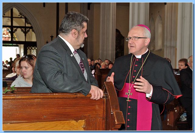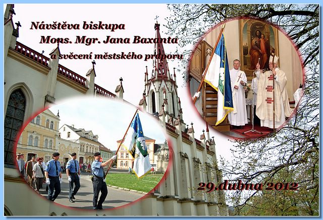 V neděli dne 29. dubna 2012 navštívil Chrastavu biskup litoměřický Monseigneur Jan Baxant. Jeho návštěva byla o to významnější, že poprvé v Chrastavě vůbec sloužil v kostele svatého Vavřince mši. Při přípravě této události bylo naším panem farářem Tomášem Genrtem nabídnuto, že pan biskup rád požehná naši vlajku. Tuto nabídku jsme s díky přijali. A tak již kolem deváté hodiny ranní spustila před radnicí ráznou muziku pochodová dechová kapela z našeho partnerského města Lwówek Śląski, která poté vyrazila ke kostelu svatého Vavřince. A hned za ní nesl hrdě originál praporu našeho města velitel městské policie Alan Grebson. Hned za vlajkou jsem měl tu čest jít já spolu se svým kolegou z polského partnerkého města Ludwikem Kaziówem a kolegou z Hrádku nad Nisou Bc. Martinem Půtou (který zároveň reprezentoval celý Euroregion Nisa, jakožto nejvyšší představitel jeho české části) a občany a návštěvníky našeho města.