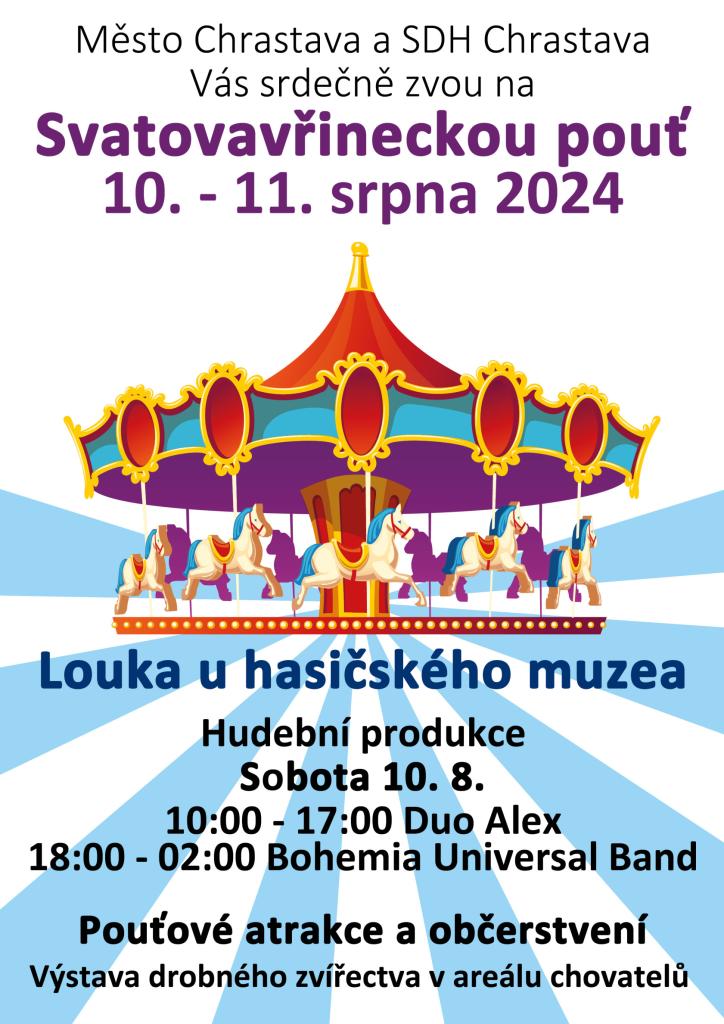 Svatovavřinecká pouť v Chrastavě se koná 10. 8. 2024 od 10:00 na louce u hasičského muzea. Vstupné zdarma.